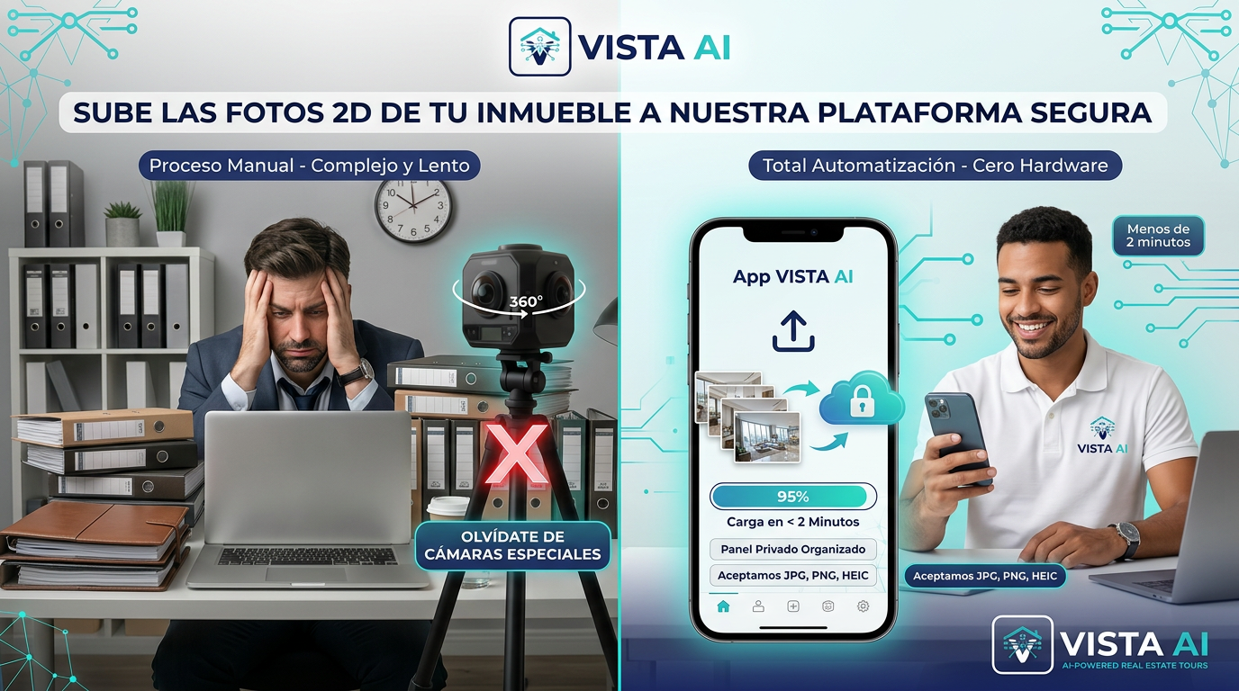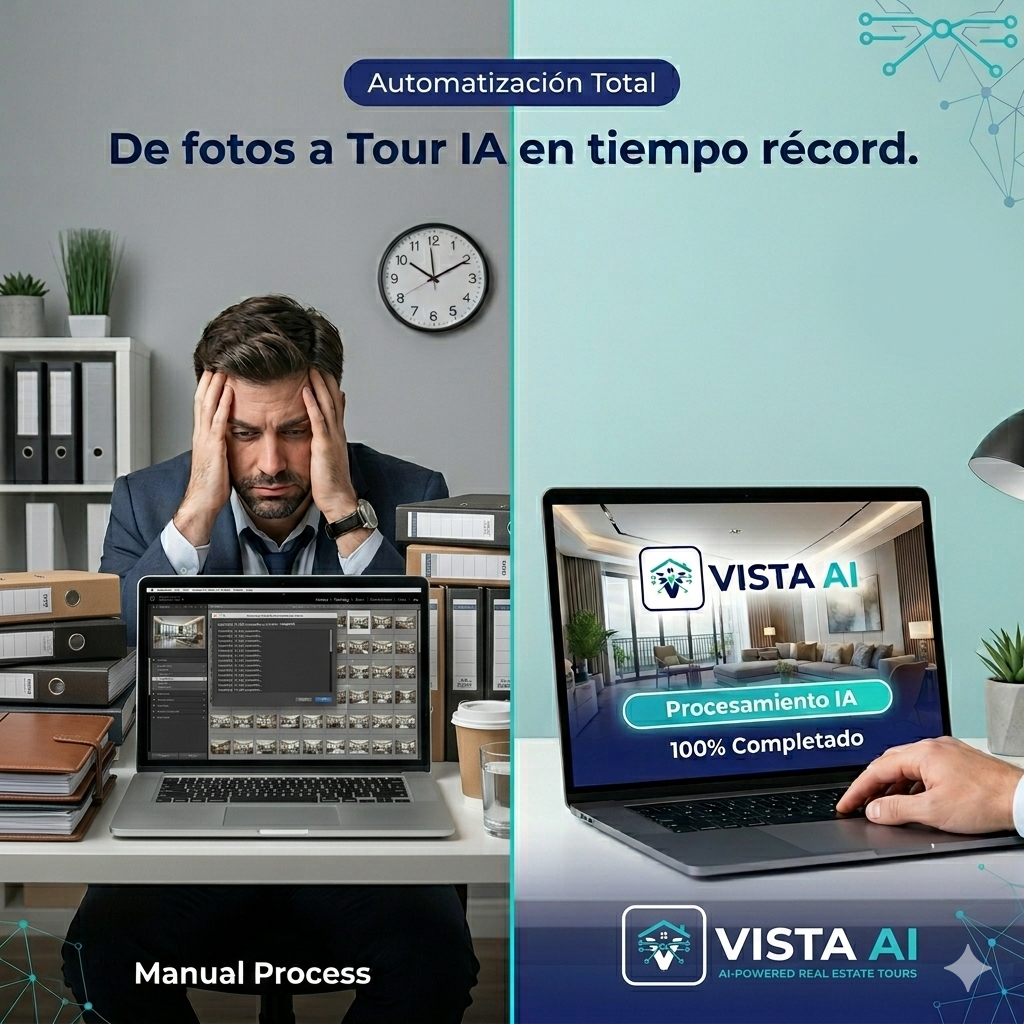 La automatización de procesos inmobiliarios de VISTA AI está diseñada para que cualquier agente pueda publicar un tour profesional en minutos, sin formación técnica y sin depender de terceros.