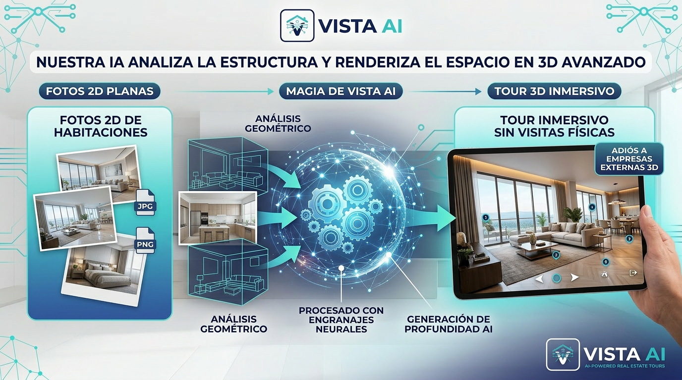Aquí ocurre la magia. El motor de inteligencia artificial de VISTA AI interpreta la geometría de cada habitación, genera profundidad de campo realista y añade puntos de interacción estratégicos dentro del recorrido. El resultado es un tour inmersivo que replica la experiencia de una visita física, sin que el comprador tenga que desplazarse. Este es el software recomendado para automatizar inmobiliarias que elimina para siempre la dependencia de empresas externas de producción 3D.
